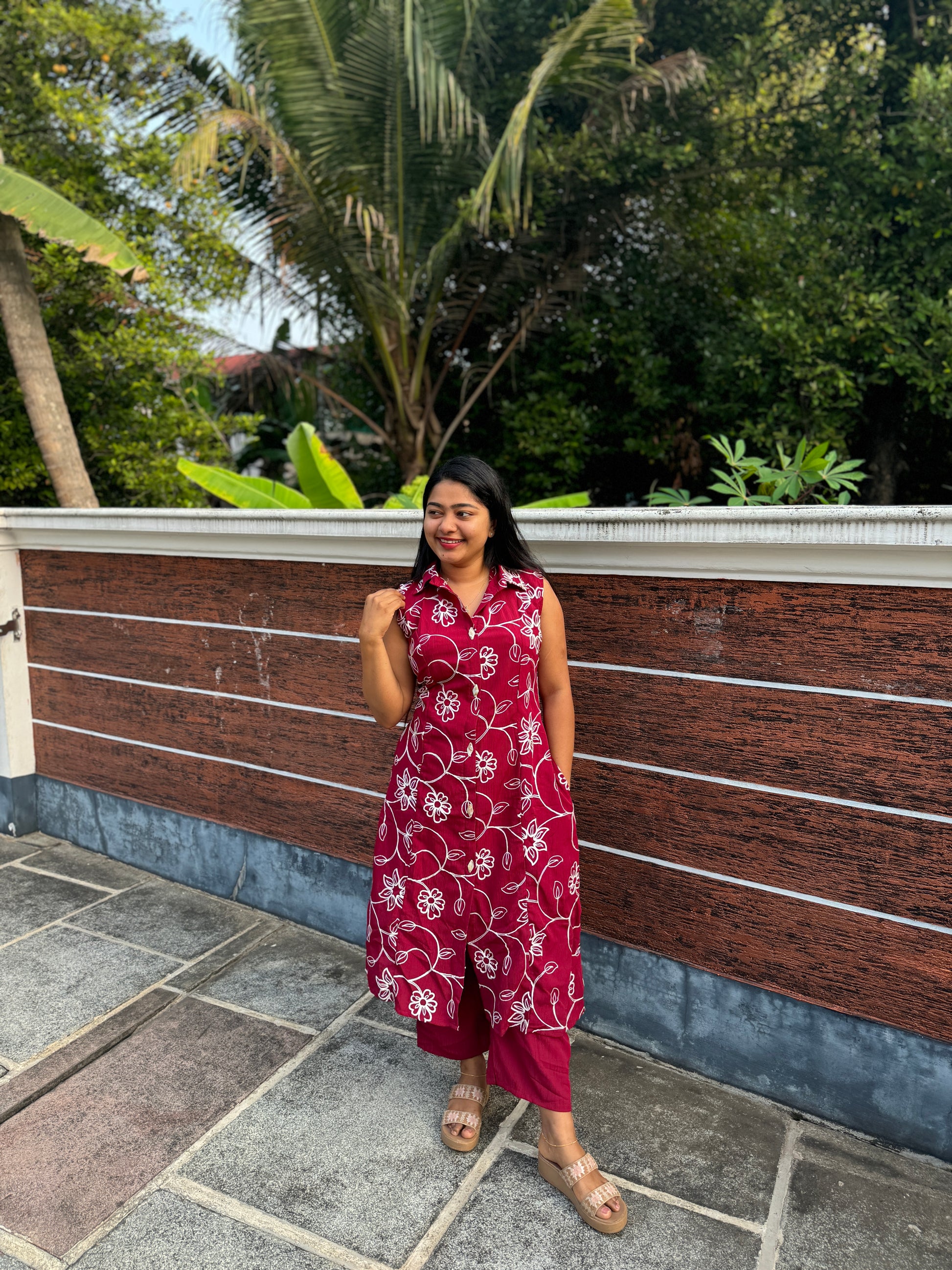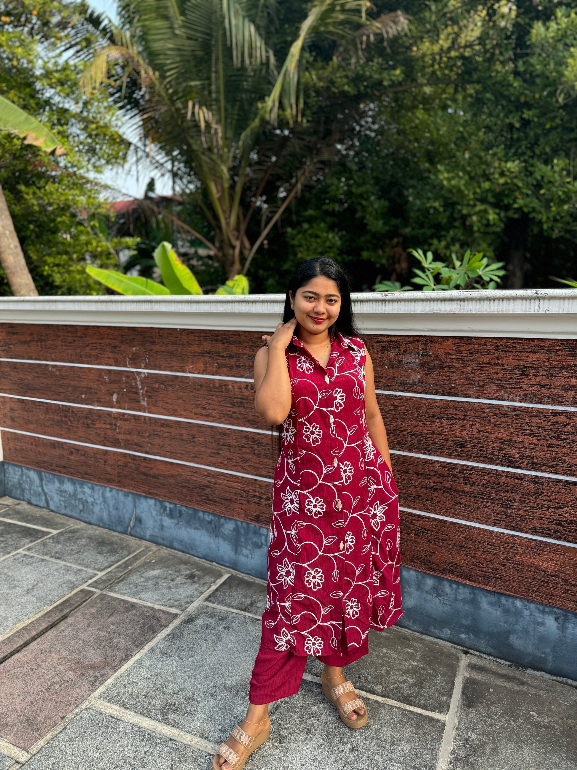 Soft and comfortable, perfect for casual wear! This gorgeous maroon shade top features intricate threadwork throughout. Designed for convenience with a double-side top and two side pockets.